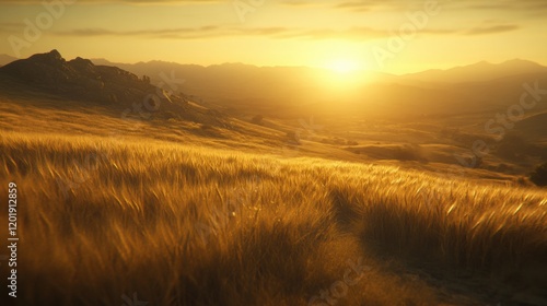 Golden Sunset Over Serene Field with Rolling Hills and Mountains
