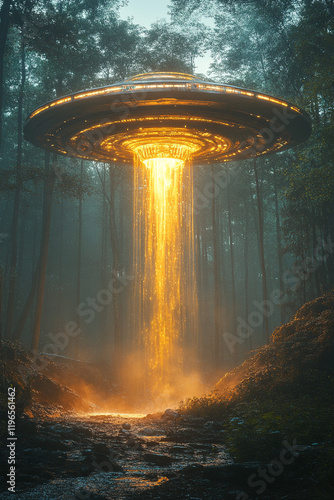 flying saucer, spaceship, alien, craft, forest, tree, wood, stream, river, water, gold, light, beam, ray, energy, mystical, magical, mysterious, aethereal, glowing, bright, dark, night, fog, misty, atmospheric, scene, landscape, nature, science, fiction, fantasy, surreal, digital, art, artwork, illustration, image, picture, concept, design