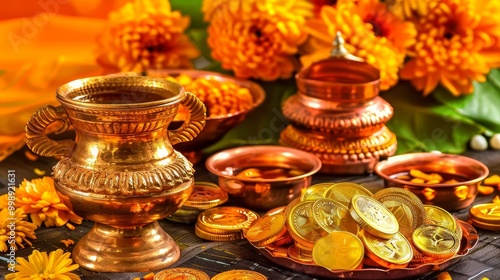 Golden Vessels with Marigold Flowers, Coins, and Ritualistic Offerings, Indian Culture, Tradition, Festival