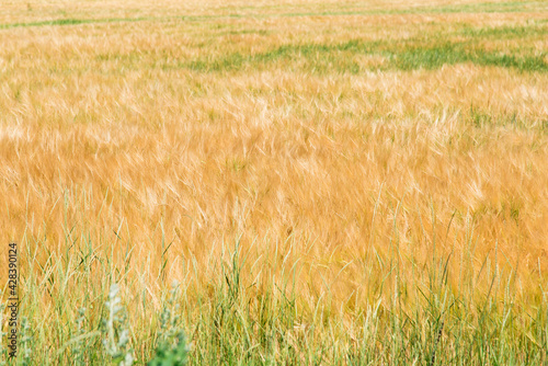 wheat, field, agriculture, grain, cereal, sky, background, barley, blue, cloud, corn, country, countryside, crop, farm, food, gold, grass, green, growth, harvest, horizon, landscape, meadow, nature, plant, ripe, rural, rye, season, seed, spikelet, summer, yellow