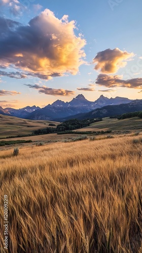 Golden Wheat Field Sunset Dramatic Mountain Range View. AI Generated
