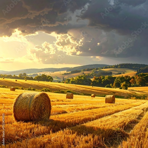 Golden wheat field with hay bales under dramatic sunset. Rolling hills and dark clouds create a serene, pastoral landscape