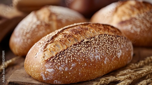 bread, loaf, artisan, bakery, baked, gold, brown, sesame, seed, rustic, wooden, surface, wheat, stalk, grain, flour, dough, crust, texture, food, delicious, tasty, crunchy, chewy, aroma, smell, fresh, homemade, oven, baking, kitchen, table, closeup, detail, photo, still life, appetising, hunger, meal, snack, ingredient, carbohydrate, diet