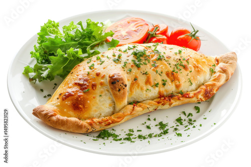 Golden-brown calzone stuffed with cheese and herbs, served with fresh lettuce and tomatoes