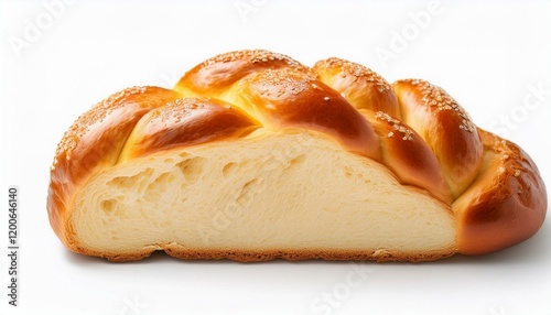 Golden-brown challah bread, sliced to reveal a fluffy interior.
