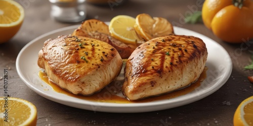 Golden-brown chicken breast, citrus marinade, kitchen setting , white background, kitchen, background