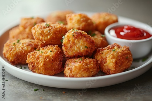 Golden-brown chicken nuggets seasoned with parsley, served alongside tangy ketchup for irresistible party-friendly finger food