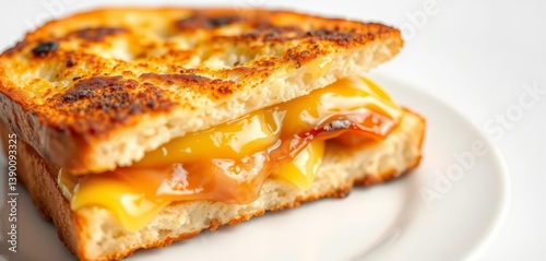 Golden-brown, crispy croque monsieur bread closeup, isolated on white, white background, food photography