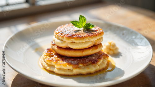 food, dessert, dish, delicious, golden brown, indoor, afternoon, bright, light, mint, plate, sweet, fluffy, texture, quality, epicure, composition, culinary, favor, treat, style, elegance, dining, baked, cosy, indulgence, breakfast, brunch, layer, high-quality, sprig, simplicity, rustic, hearty, savoury, closeup, aesthetic, visual, hand-made, artisanal, 1, presentation, mouth-watering, delightful, warm