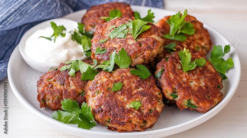 Golden-brown pork fritters, garnished with fresh herbs and a side of sour cream
