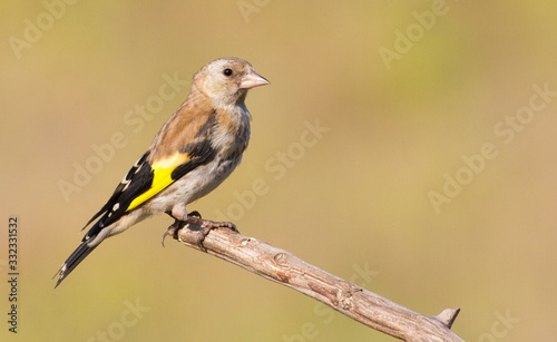 Goldfinch, Carduelis. Young bird. The bird sits on a branch