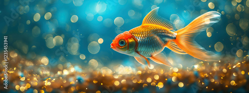 Goldfish glows with golden sparkles while swimming in a dreamy blue background for modern design