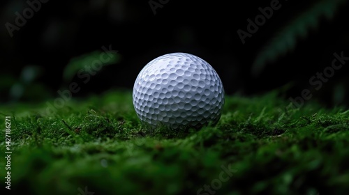 Golf ball resting on moss-covered ground. A pristine white golf ball sits centered on a bed of lush, dark green moss in a shadowy, natural setting