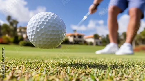 Golf Ball Soaring Through the Air During a Sunny Day on a Well-Maintained Golf Course, Capturing the Moment of Excitement