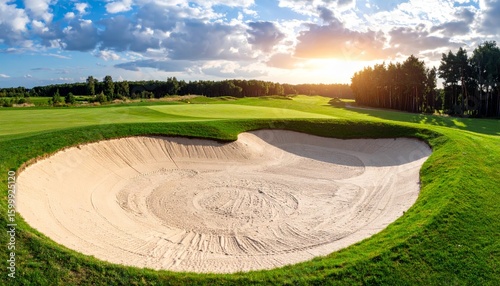 Golf course at sunset with beautiful sky and sand trap, drone view