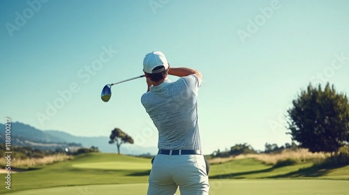 man, golf, practice, activity, challenge, essence, passion, leisure, landscape, tee, skill, hobby, sky, technique, ball, nature, scenery, green, enjoyment, club, player, precision, timing, sport, target, dynamic, strategy, serene