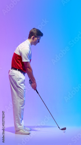 Golfer in red and white shirt focuses on golf ball, holding club with calm posture under neon light against gradient studio background. Concept of luxury sport, tournament, leisure