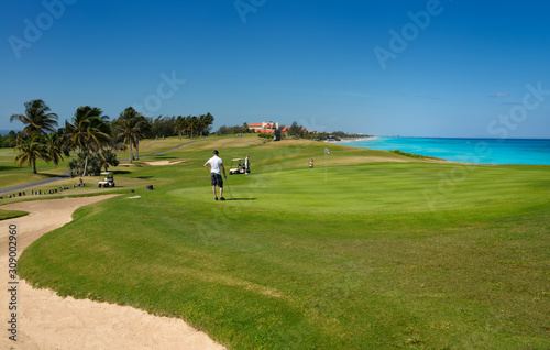 golfer, play, golf, course, cuba, playing, game, greener, grass, turquoise, water, shore, white, sand, beach, resort, hotel, peninsula, spit, tropical, atlantic, ocean, sea, vacation, holiday, tour tourism, holiday maker, sun, travel, palm tree