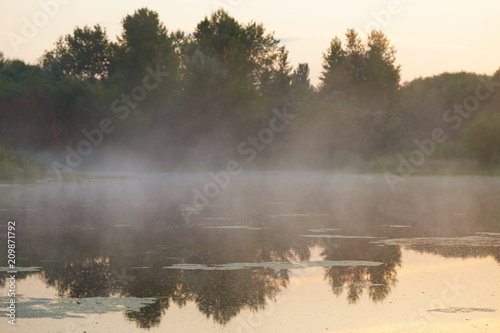 GOMEL, BELARUS. the mist spreads over the water at dawn.