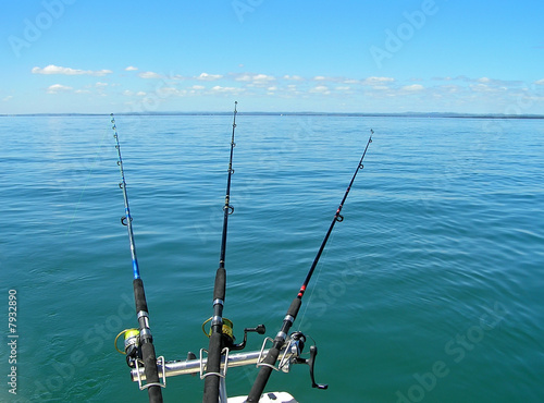 fishing, rod, three, blue, calm, sea, ocean, reel, ripple, relaxing, hobby, tackle