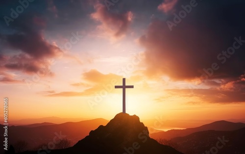 Good Friday concept: Silhouette cross on mountain sunset background, Generative AI