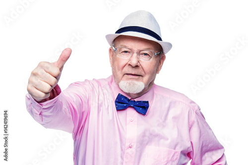 emotional, grandfather, thumb, victory, bow tie, excited, 70s, 80s, adult, aged, care, caucasian, copy space, elderly, face, fan, fashion, goggles, grandfather, grandparent, great, photogenic, happiness, happy, health, health care, healthy, isolated, male, man, mature, old, older, pensioner, people, person, pink, portrait, retire, retirement, senior, shirt, smiling, studio, success, succeed, winner, white