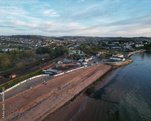 Goodrington Sands, Torbay, South Devon, England: DRONE AERIAL VIEW: South Sands beach, colourful beach huts and the sea.