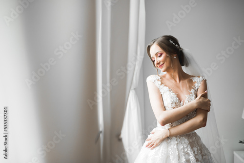 Gorgeous bride in robe posing and preparing for the wedding ceremony face in a room