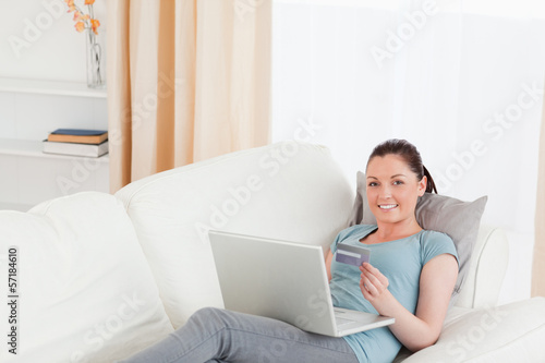 20s, young adult, woman, female, caucasian, adult, beautiful, beauty, brightness, brunette, buying, card, casual attire, clothing, comfort, couch, european, face, fashion, happiness, happy, home, house, indoor, cyberspace, laptop, lifestyle, living, looking, lying, nice, online, pillow, portrait, posing, pretty, relaxing, room, single, smiling, sofa, technology, white, wireless