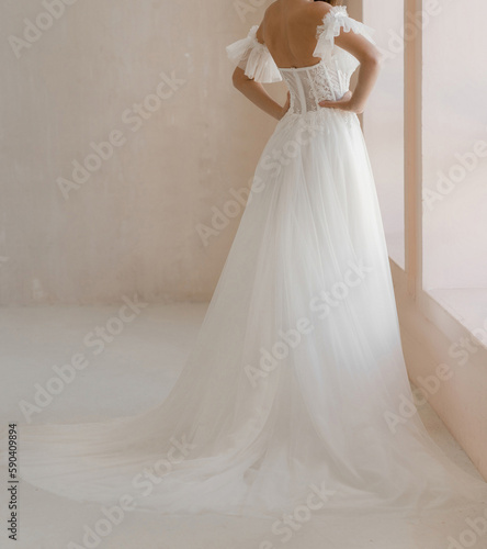 Gorgeous long wedding backless dress decorated with floral lace. Bride in the shoulderless white wedding dress with and fancy sleeves
