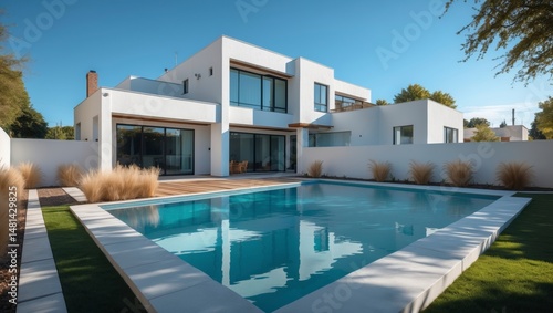 Gorgeous three-story modern house with sleek architecture, expansive , a welcoming front porch, and lush landscaping creating a beautiful suburban residence under clear blue skies