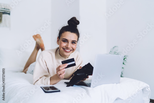Gorgeous woman showing credit card while lying on bed