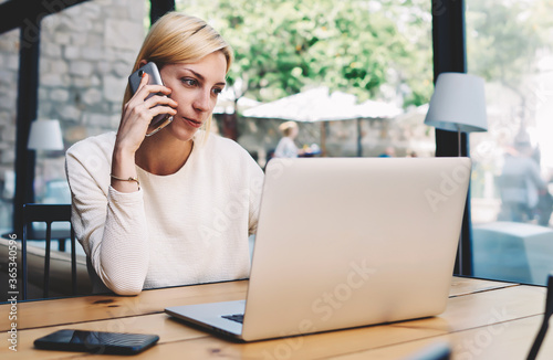Gorgeous young business woman having cell phone conversation while sitting front open laptop computer in modern coffee shop interior, female person talk on smartphone while looking to net-book screen