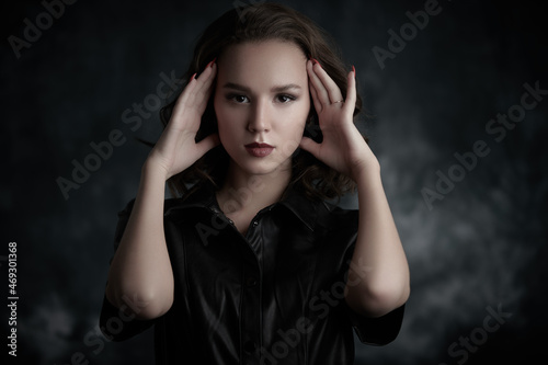 fashion, dark, woman, gorgeous, sexy, adult, arm, attractive, background, beautiful, beauty, black, brown hair, caucasian, clothes, confident, cosmetic, curly, dress, elegance, face, fashionable, female, feminine, girl, glamour, grunge, hair, coiffure, lady, leather, lip, make-up, model, modern, person, pretty, red, red nail, seductive, sensual, sexual, slender, slim, stylish, studio, trendy, vogue