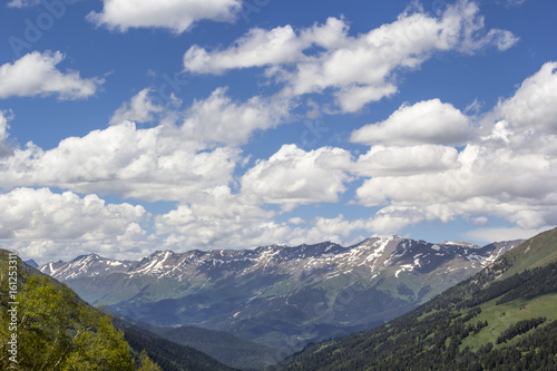 Горный пейзаж, красивый вид на живописные горные склоны, панорама горного ущелья, белые облака на небе, дикая природа и горы Северного Кавказа