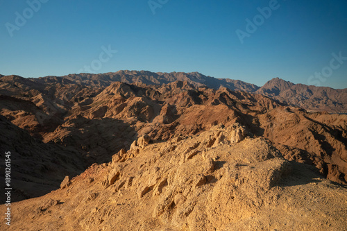 Górski krajobraz Egiptu przy zachodzie słońca – surowe, skaliste zbocza i złote światło