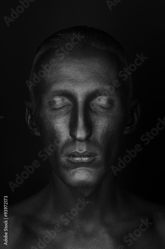 Gothic and Halloween theme: a man with black skin is isolated on a black background in the studio, the Black Death body art