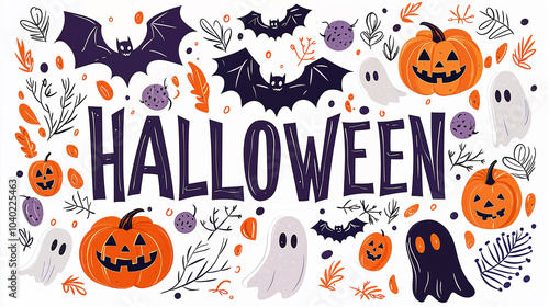 gothic lettering “HALLOWEEN" in bold, surrounded by flat, stylized pumpkins, bats, and ghost shapes