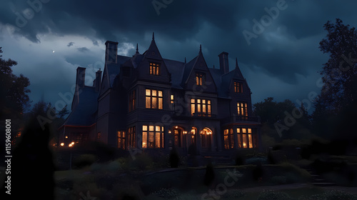 Gothic mansion at dusk under stormy skies, lit windows suggest mystery or elegance, ideal for spooky themes. Twilighted. Illustration