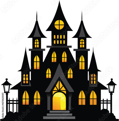 Gothic Mansion With Glowing Lanterns Silhouette Clean