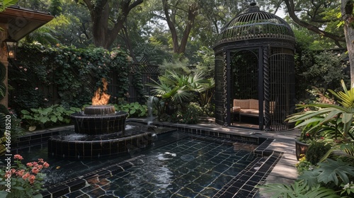Gothic Romance Garden with Black Tiled Pool and Wrought Iron Fire Cage