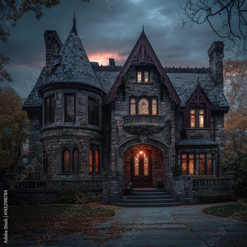 house, stone, gothic, dark, evening, autumn, skittish, castle, old, historic, exterior, building, architecture, twilight, night, fall, window, door, masonry, turret, ornamental, charming, dramatic, light, lantern, creepy, halloween, mystery, elegant, grand, home, villa, luxury home, detail