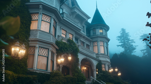 gothic, luxury home, architecture, castle, turret, vintage, historical, eerie, dark, old, luxurious, classic, skittish, victorian, grand, estate, dramatic, moody, mysterious, elegant, night, illuminated, fantasy, fairy tale, mediaeval, storytelling, rich, cinematic, atmospheric, grandeur