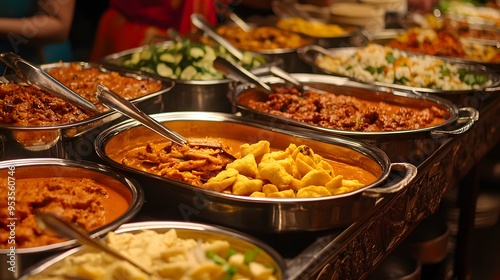 gourmet buffet spread, vibrant colorful dishes, diverse cuisine, appetizing food display, stainless steel serving trays, assorted vegetables, spicy curries, crispy samosas.