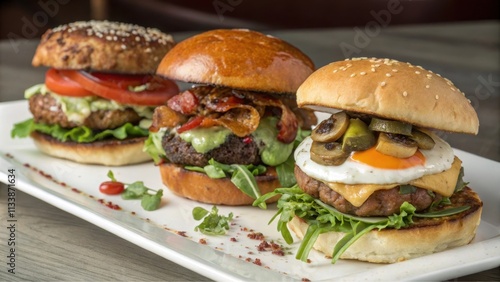 Gourmet Burger Trio A delectable selection of artisan burgers featuring unique toppings and flavorful sauces.