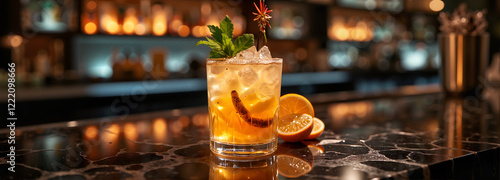 Gourmet caipirinha with citrus slices on a glossy bar countertop, elegance
