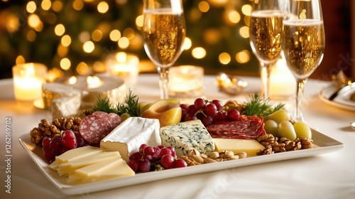 Gourmet cheese and charcuterie platter with wine glasses on a festive table with warm candlelight. Elegant holiday dining and celebration concept.