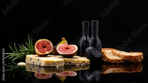 cheese, fig, rosemary, gourmet food, food photography, still life, dark background, yellow cheese, bread, cracker, delicious, culinary, gastronomy, wine, olive oil, horizontal, closeup, stylish, elegant, dark, rich, rustic, healthy, fresh, tabletop, high-end, luxury, modern