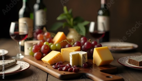 Gourmet Cheese Grapes Platter with Red Wine Wooden Board