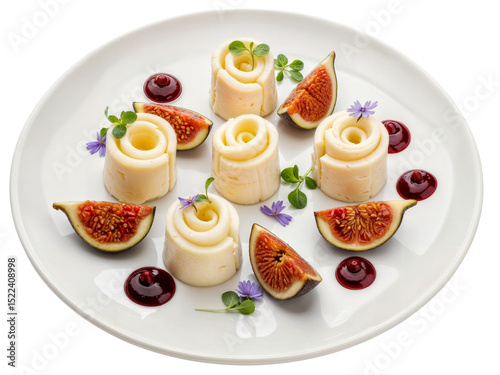 Gourmet cheese rolls with fresh figs and berry sauce on a white plate